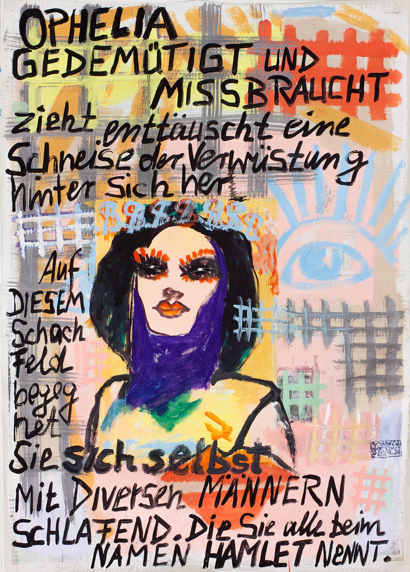 Hamlet Cyborg Infernal Machine painting on newspaper, acrylic, 70 sheets, 2 intro sheets ~112x79cm 2017 27-hamlet-cyborg-infernal-machine Bild 29 von 72