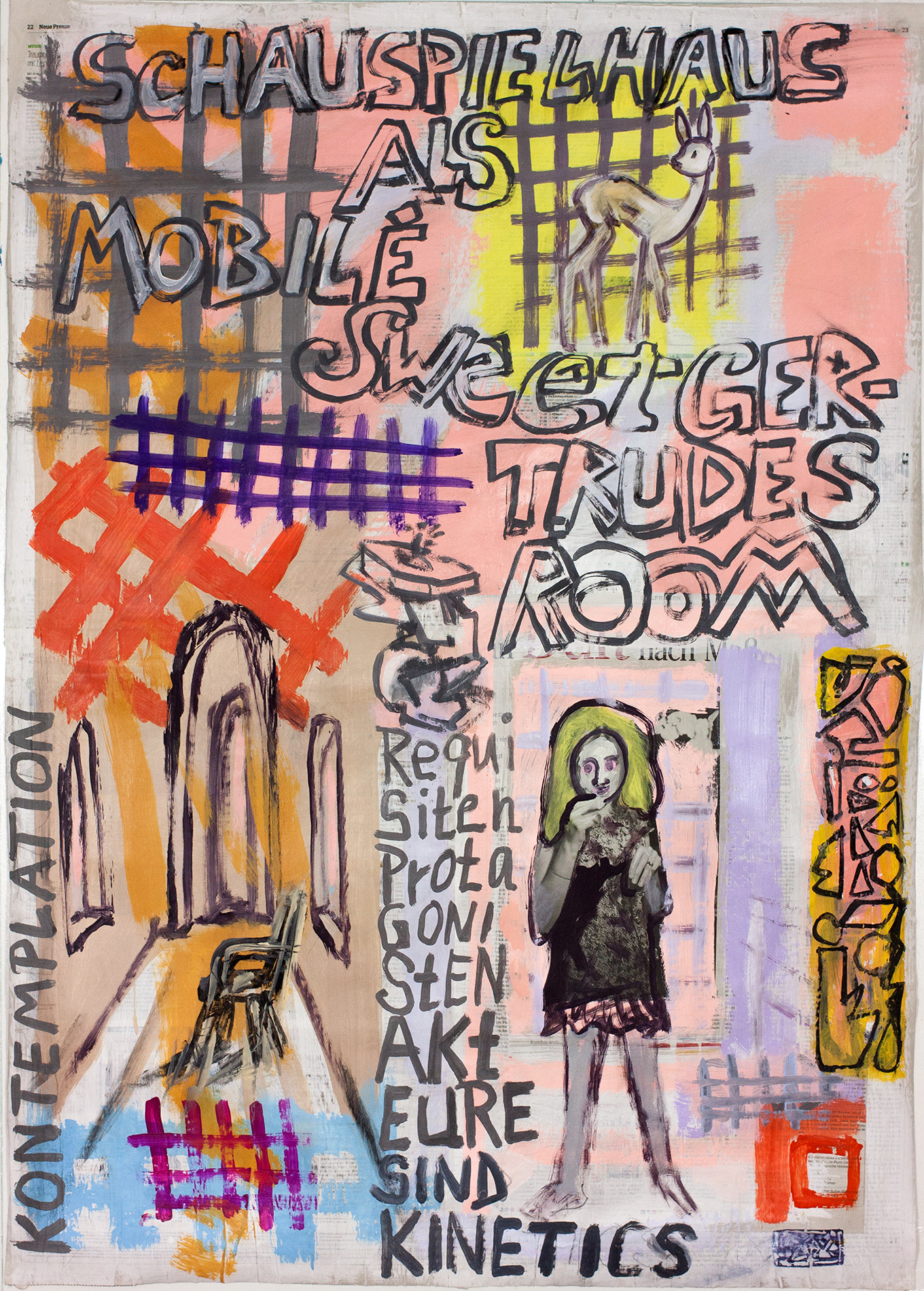 Hamlet Cyborg Infernal Machine painting on newspaper, acrylic, 70 sheets, 2 intro sheets ~112x79cm 2017 28-hamlet-cyborg-infernal-machine Bild 30 von 72