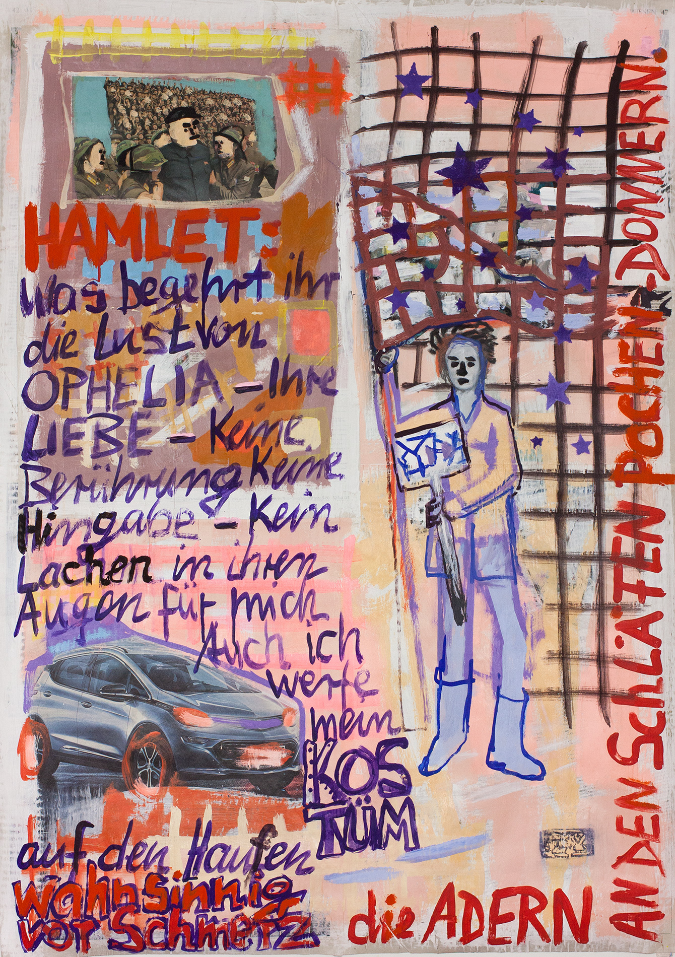 Hamlet Cyborg Infernal Machine painting on newspaper, acrylic, 70 sheets, 2 intro sheets ~112x79cm 2017 42-hamlet-cyborg-infernal-machine Bild 44 von 72