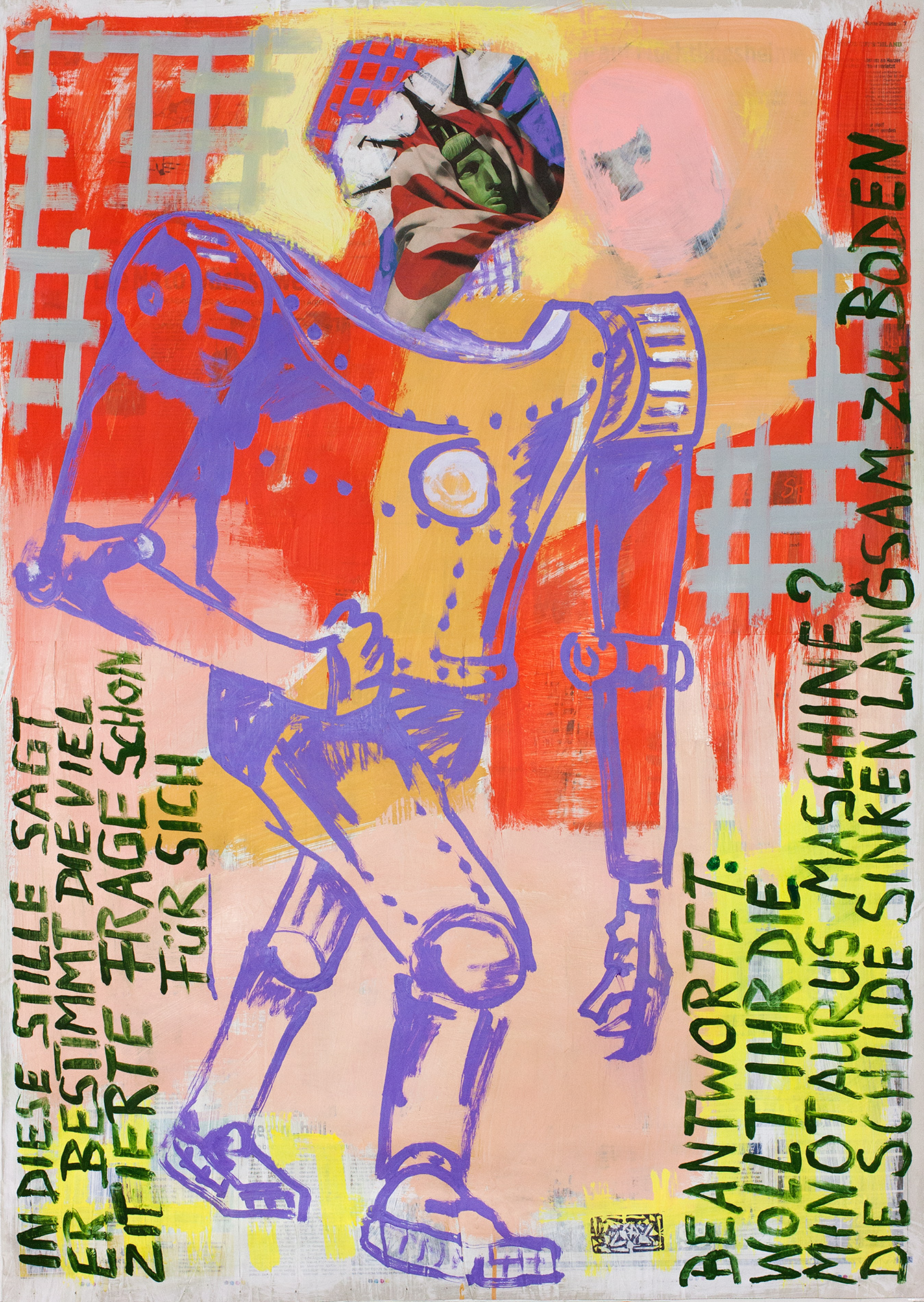 Hamlet Cyborg Infernal Machine painting on newspaper, acrylic, 70 sheets, 2 intro sheets ~112x79cm 2017 46-hamlet-cyborg-infernal-machine Bild 48 von 72
