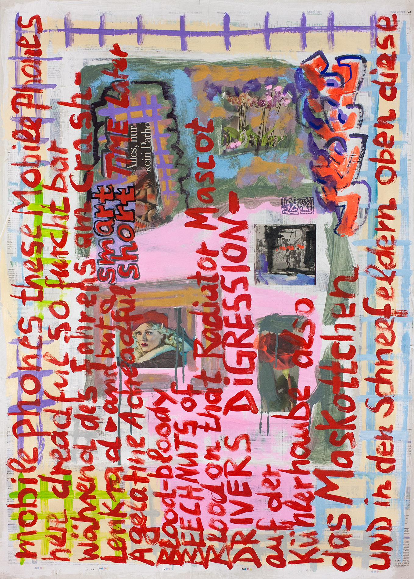 Hamlet Cyborg Infernal Machine painting on newspaper, acrylic, 70 sheets, 2 intro sheets ~112x79cm 2017 62-hamlet-cyborg-infernal-machine Bild 64 von 72