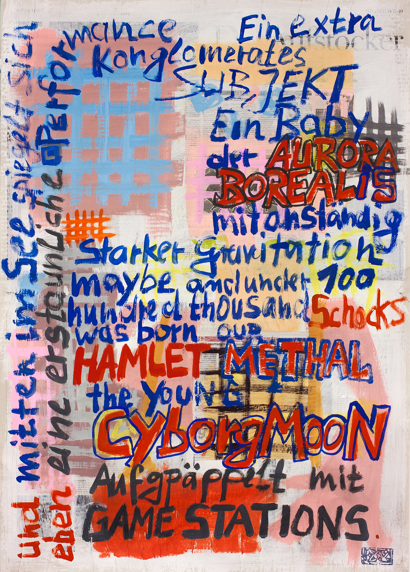 Hamlet Cyborg Infernal Machine painting on newspaper, acrylic, 70 sheets, 2 intro sheets ~112x79cm 2017 66-hamlet-cyborg-infernal-machine Bild 68 von 72