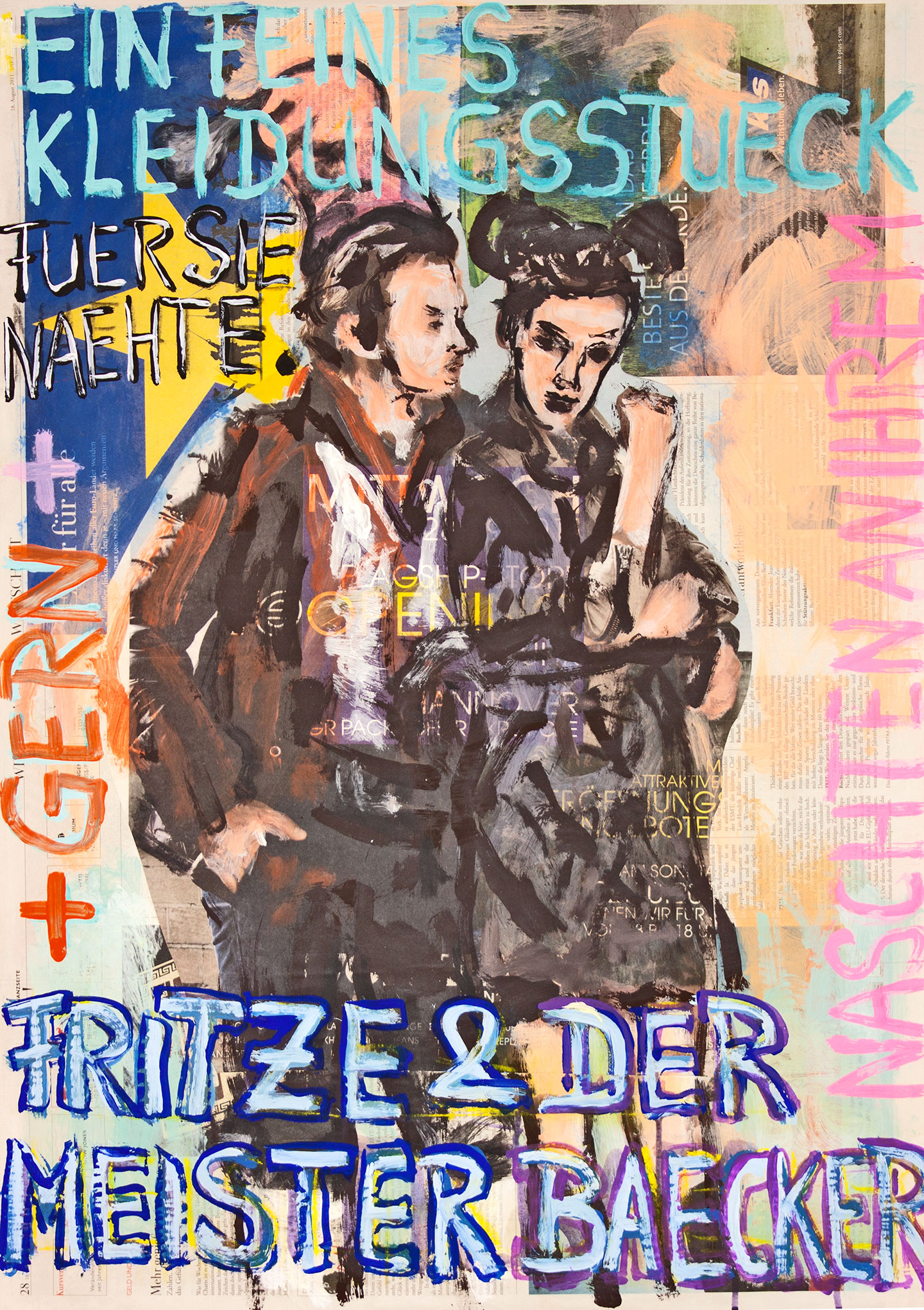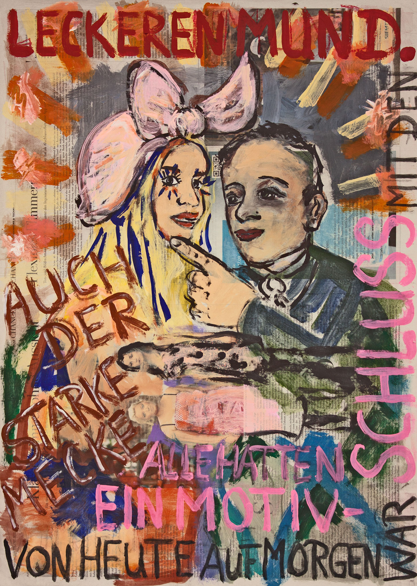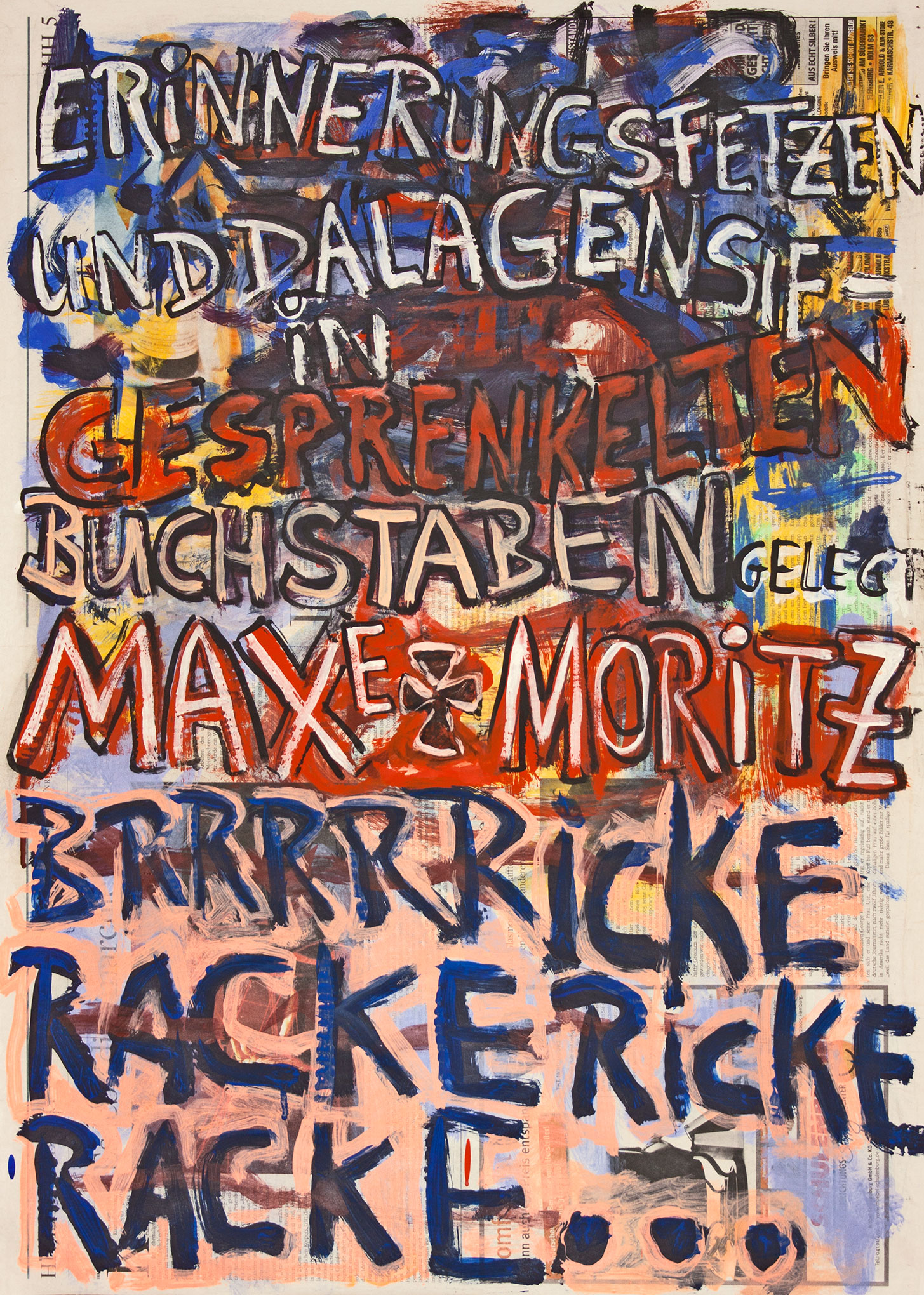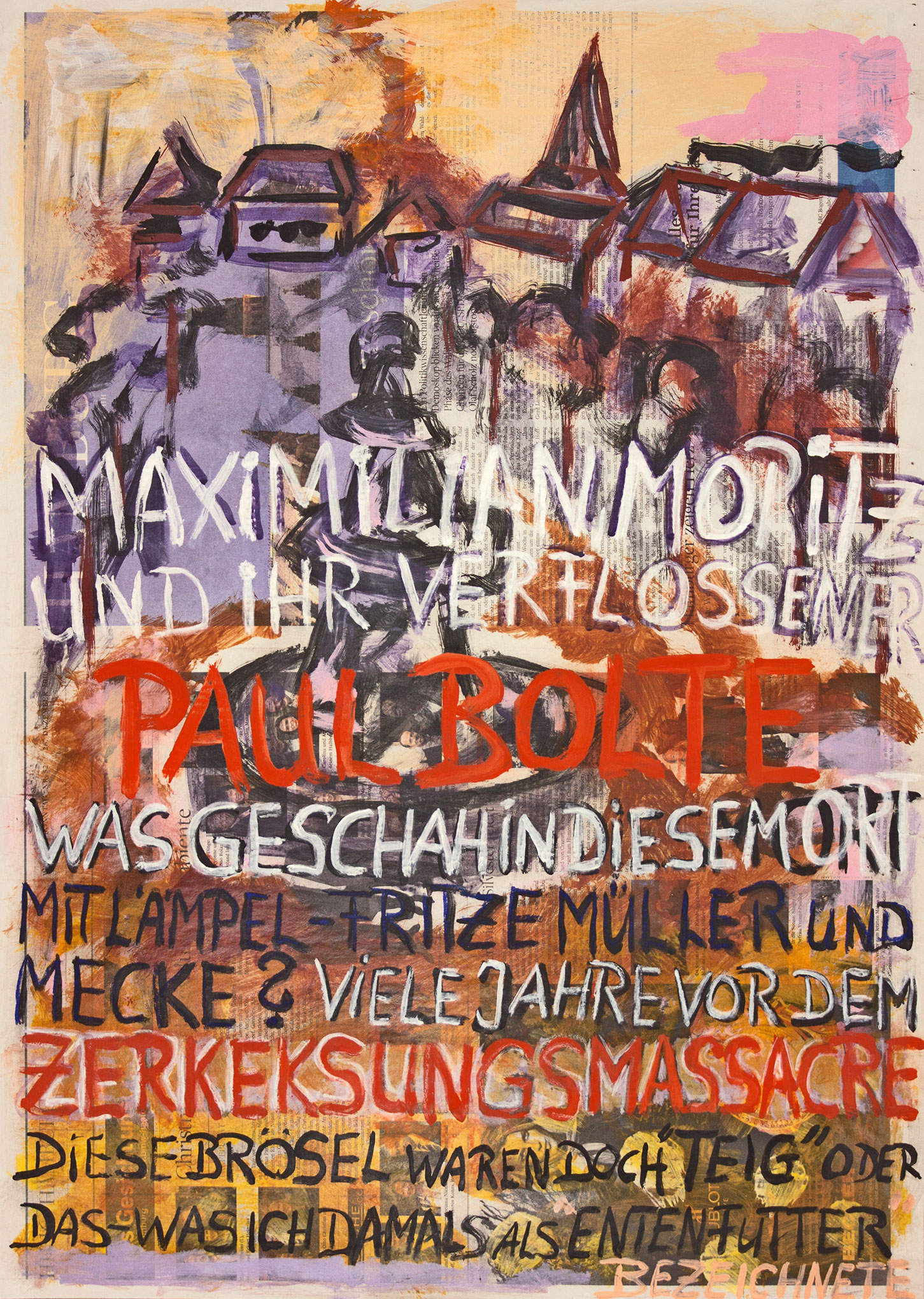 „Widow Bolte – memories of the dramatic incident which occurred in the village, most of you know. Lämpel, Fritze, Mecke, and many others, not forgetting the little devils „Maximilian and Moritz“, were in this place witnesses or heir of this terrible events. What happened to Paul Ludwig Bolte? Protocol and memory traces of a crime. Acrylic painting on newspaper / 12 sheets – in reference to the story, with and about people from „Max and Moritz“ by Wilhelm Busch (1832-1908). «