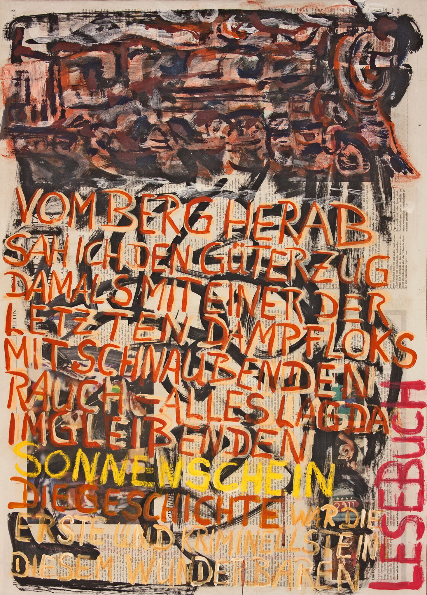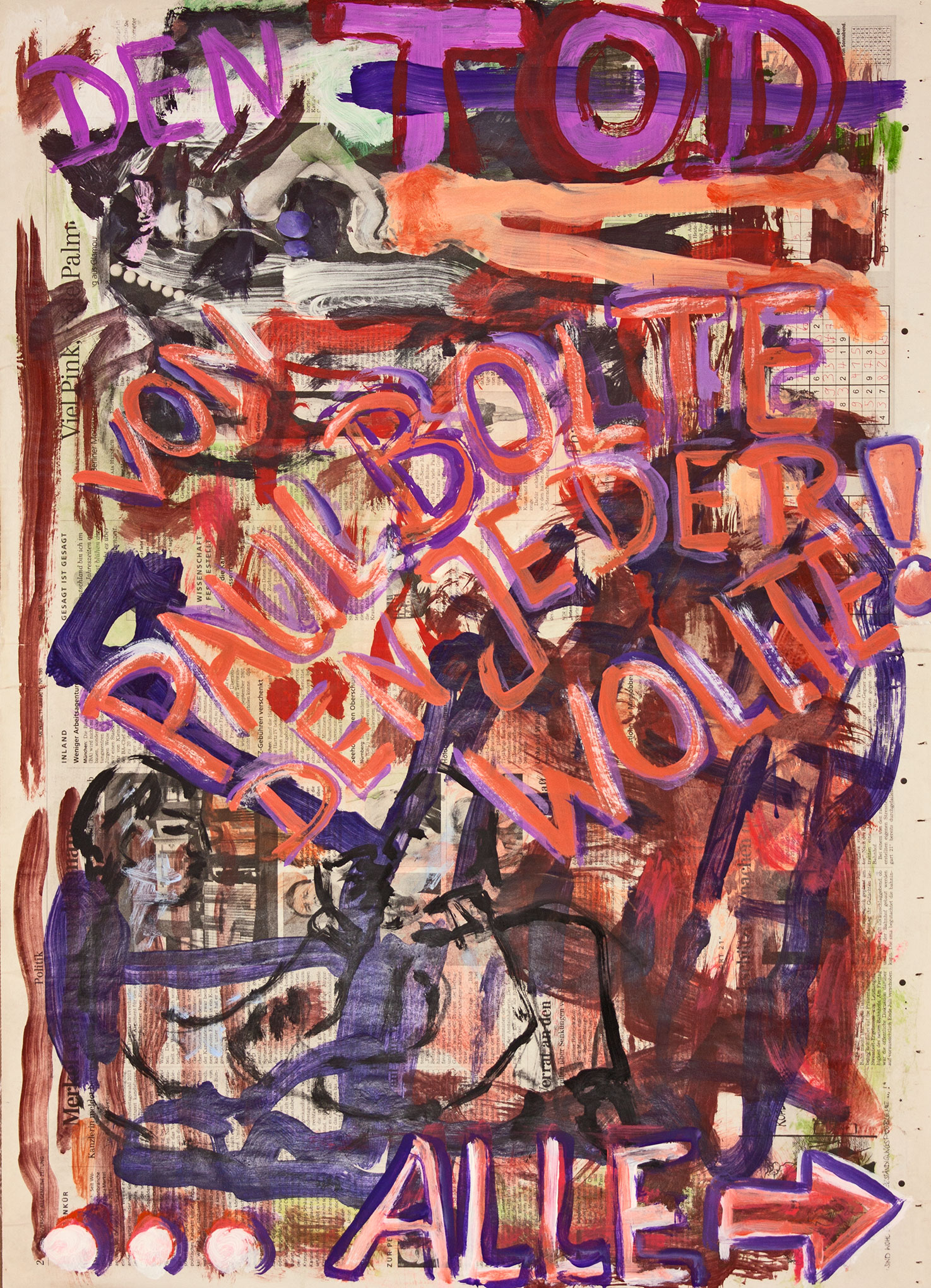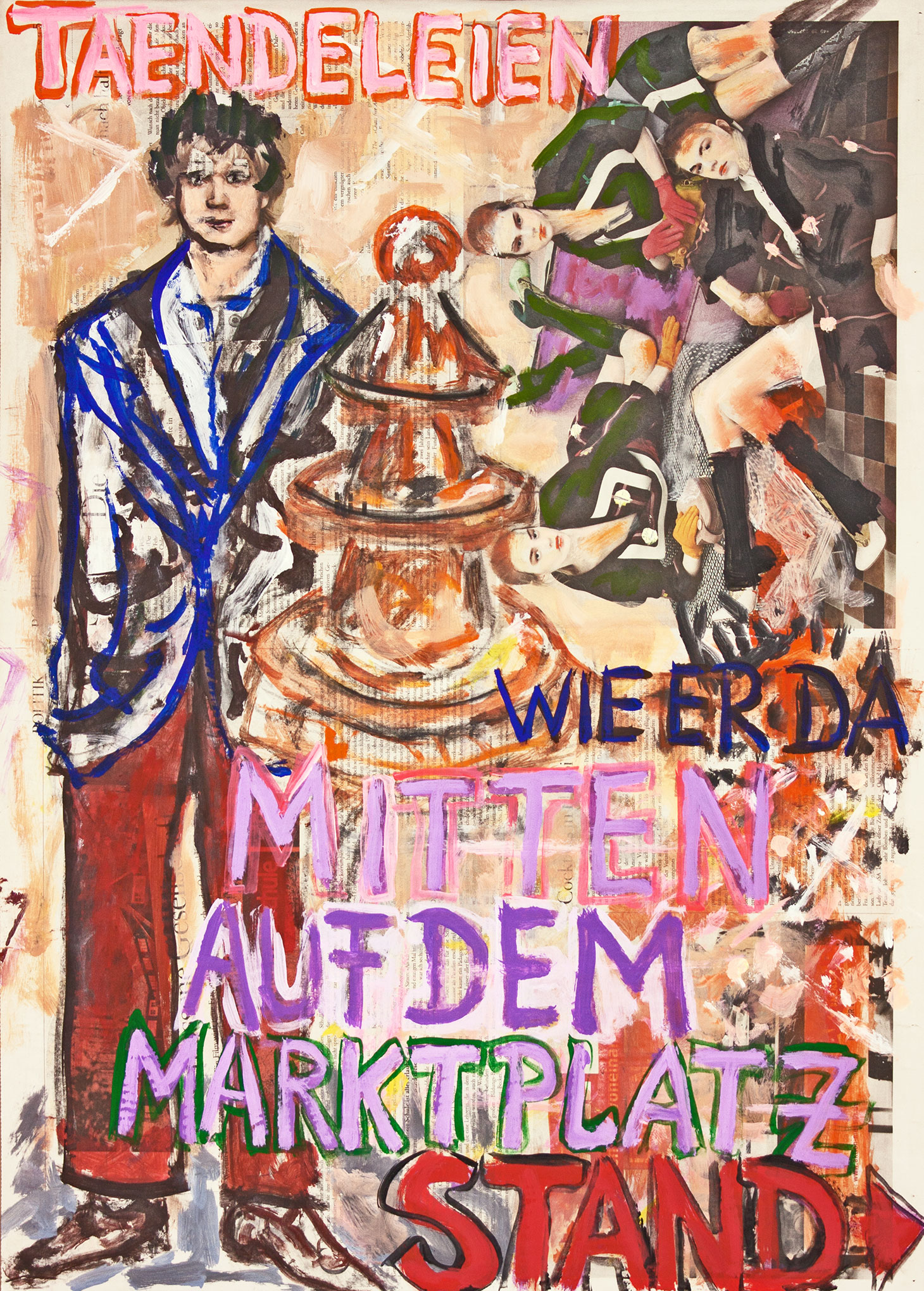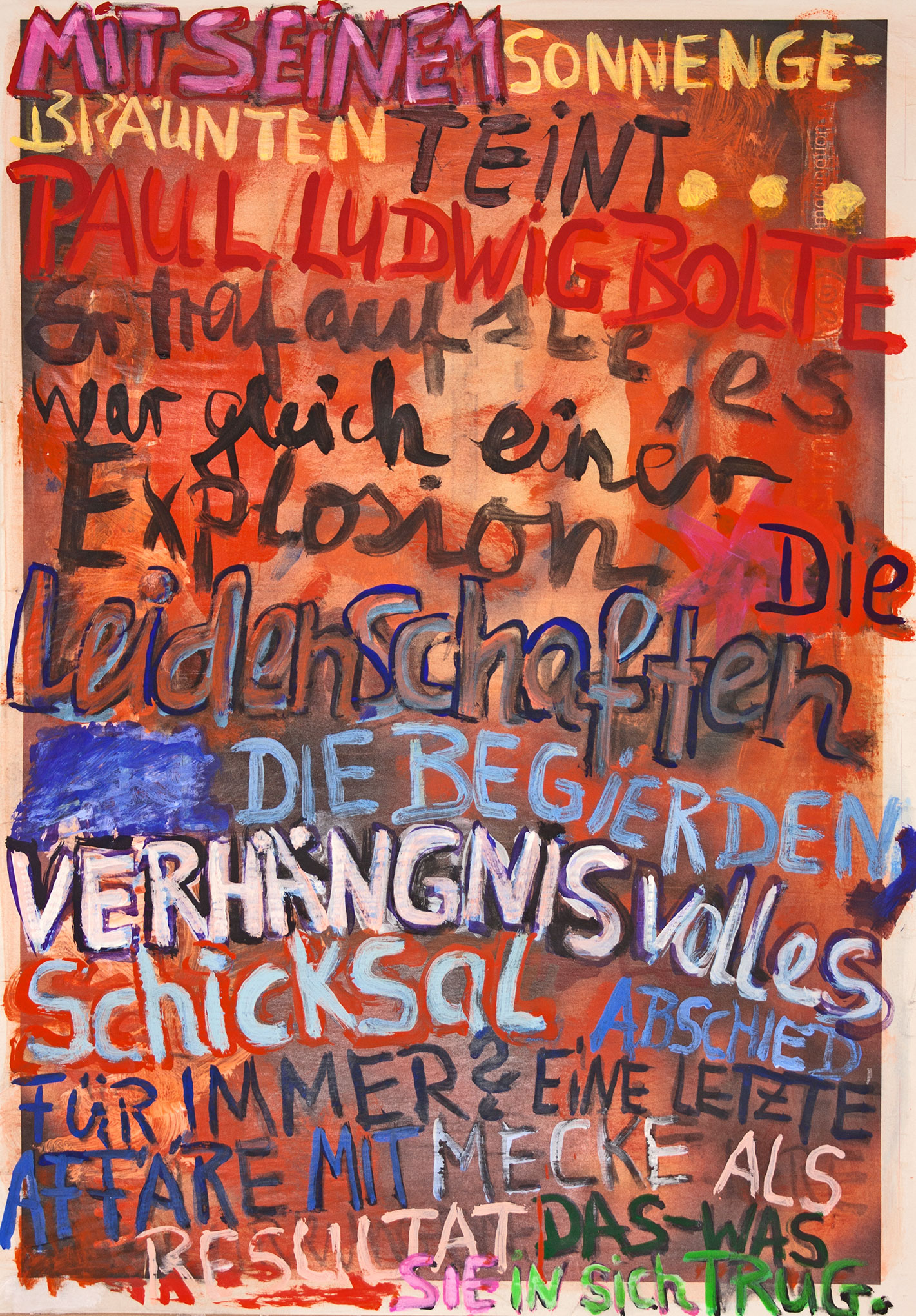 „Widow Bolte – memories of the dramatic incident which occurred in the village, most of you know. Lämpel, Fritze, Mecke, and many others, not forgetting the little devils „Maximilian and Moritz“, were in this place witnesses or heir of this terrible events. What happened to Paul Ludwig Bolte? Protocol and memory traces of a crime. Acrylic painting on newspaper / 12 sheets – in reference to the story, with and about people from „Max and Moritz“ by Wilhelm Busch (1832-1908). «