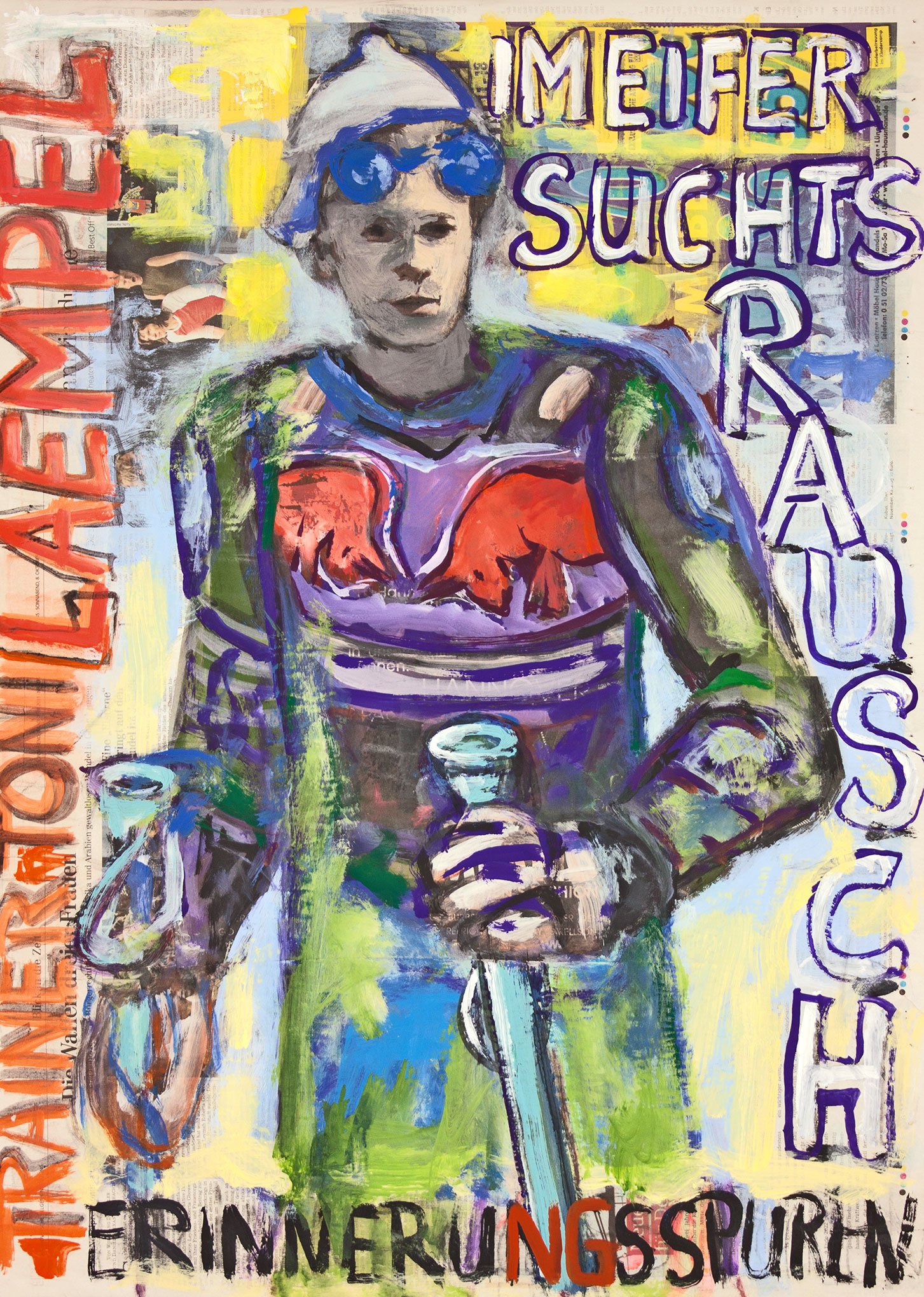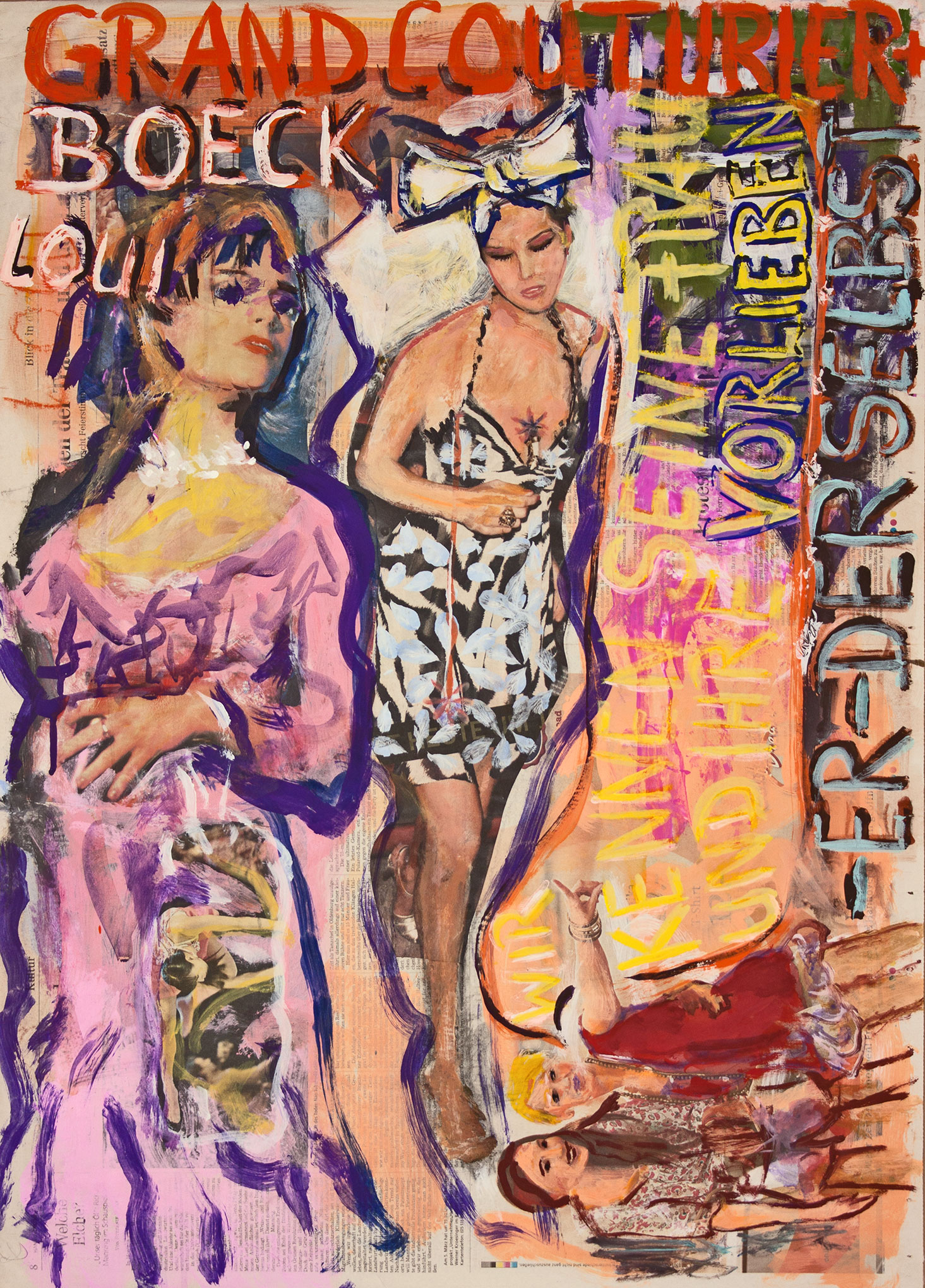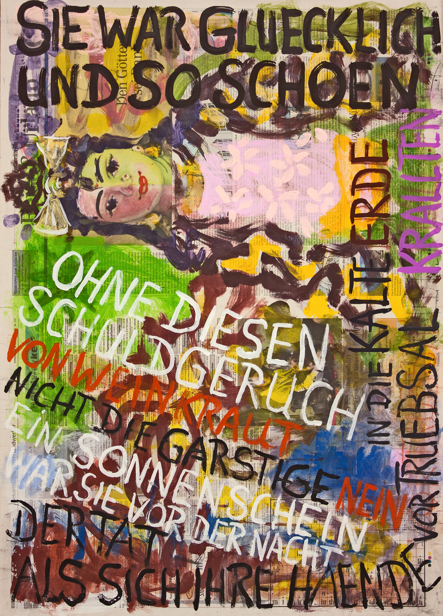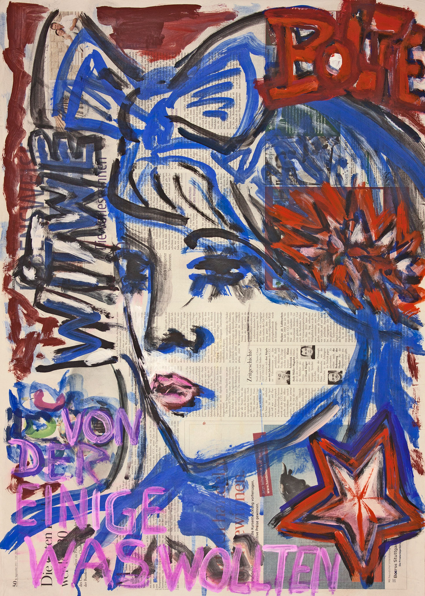 „Widow Bolte – memories of the dramatic incident which occurred in the village, most of you know. Lämpel, Fritze, Mecke, and many others, not forgetting the little devils „Maximilian and Moritz“, were in this place witnesses or heir of this terrible events. What happened to Paul Ludwig Bolte? Protocol and memory traces of a crime. Acrylic painting on newspaper / 12 sheets – in reference to the story, with and about people from „Max and Moritz“ by Wilhelm Busch (1832-1908). «