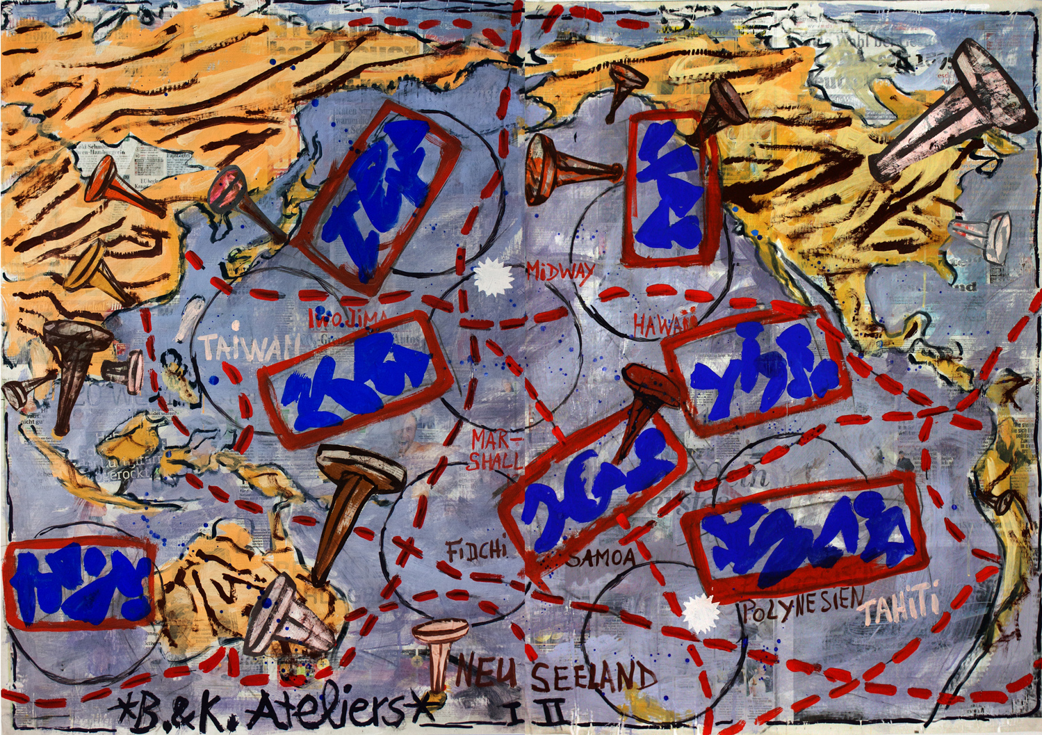 Pacific Ocean Archipels – Climate Protection Edition painting on newspaper, acrylic, 16 sheets, ~112x79cm 2015 02-4-Island-2teilig Bild 2 von 16 01-2-Pacific-Ocean-Archipels-2teilig02-4-Island-2teilig05-Black-Flag06-Skulls,-Guns,-Bones,-Shells-07-Marshall-Hawaii08-Oyster-Pearls-Pirates09-Phönix-fruity10-Our-Shelters-Now11-Porte-Avions12-Island-Groups13-Sea-Food-Delicacys14-Corals-Pearls15-Wale-Watching16-James-Cook17-Tasman18-Megellane-Ellice